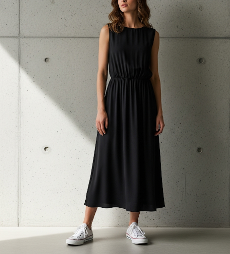 Pairing a black dress with sneakers makes for a stylish yet laid-back everyday look.