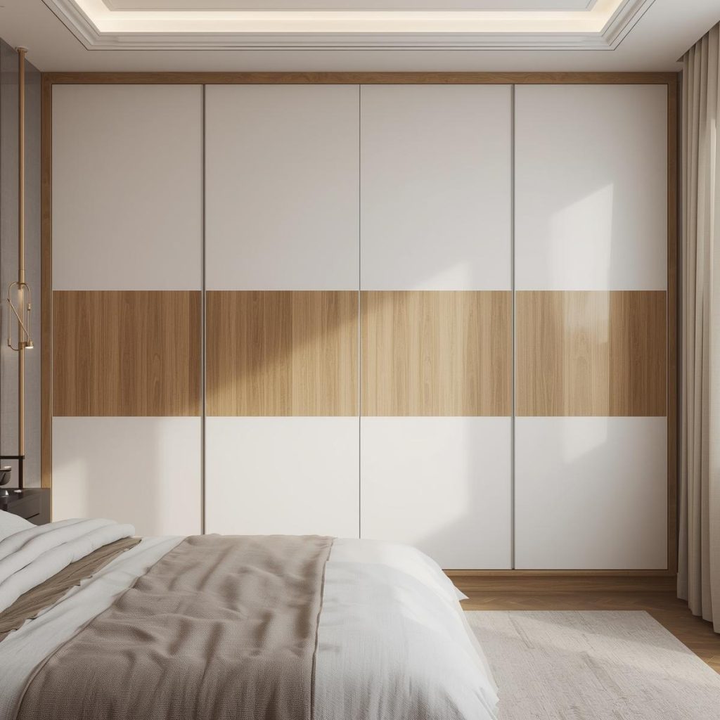 A two-tone wardrobe adds personality without overwhelming the space. Combine neutral shades like white and wood for balance. Dark and light contrasts create depth and interest. This design works well in contemporary bedrooms. It breaks the monotony of a single-color wardrobe. Choose complementary colors to match your bedroom theme.
